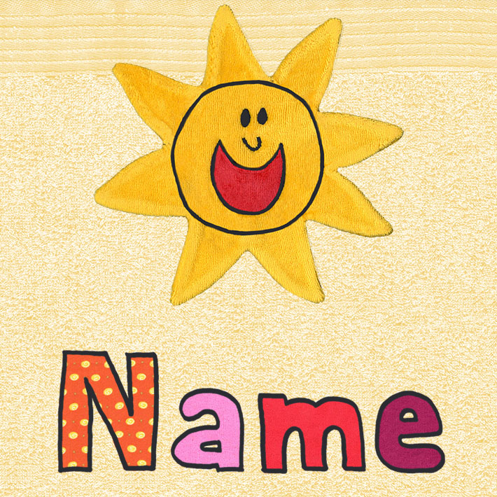 Das Baby-Badtuch mit Namen, Motiv und Sonne zeichnet sich durch die leuchtende Sonne, die lustigen und fröhlichen Motive aus und dass die Namen für jedes Tuch individuell gewählt werden können.